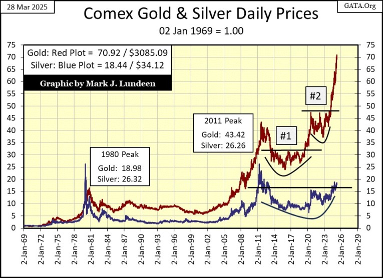 Below is a chart for the indexed values for gold and silver going back to 1969. Gold is on a tear! It has advanced from 47 to over 70 over the past sixteen months. Usually, seeing such a powerful upward spike in valuation, would suggest a price correction is due. I’m sure there are people waiting for a pullback in the price of gold before they buy.