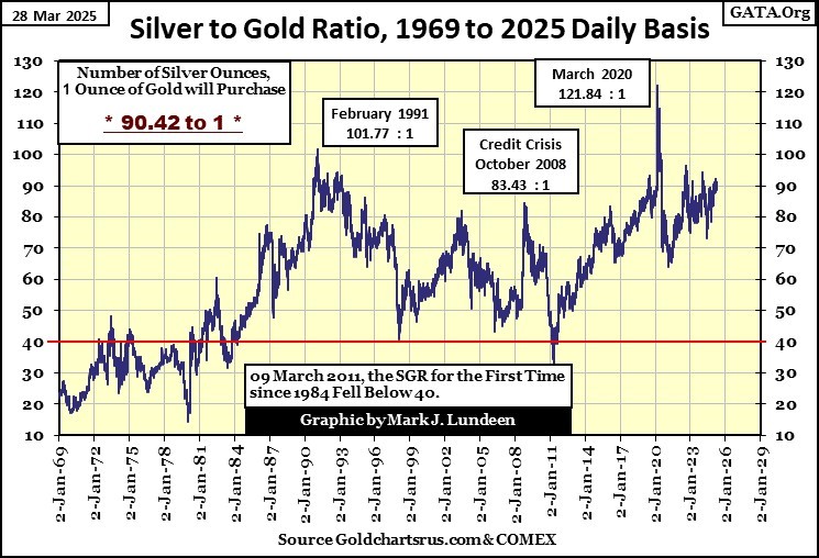 Looking at the silver to gold ratio (SGR) in the chart below, this week closed with a SGR of 90.42, or 90.42 ounces of silver for 1 ounce of gold. At the close of March 2025, one ounce of gold can buy 5.65 pounds of silver!