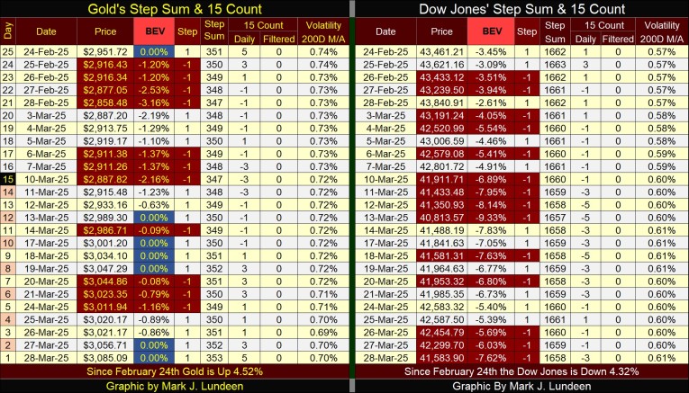 Looking at gold’s step sum table below, we see the seven new all-time highs in gold, highlighted BEV Zeros in blue and gold. Gold’s 15-count closed the week at a +5. I’d like to see some down days for gold in the following weeks, to keep the market from getting overbought, by keeping gold’s 15-count under +7. Gold’s daily volatility’s 200D M/A is trending down, as its valuation is trending up. That is a bit odd, but I’ll take gold’s advancement anyway it comes.