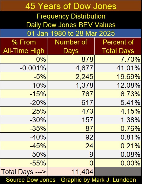 Another way of understanding the above BEV plot, is looking at the Dow Jones’ BEV Frequency Table below. The 0% row, since January 1980, it has seen 878 daily closes at a new all-time high, or 7.70% of all daily closes for the past forty-five years, have been at a new all-time high. That is a lot!