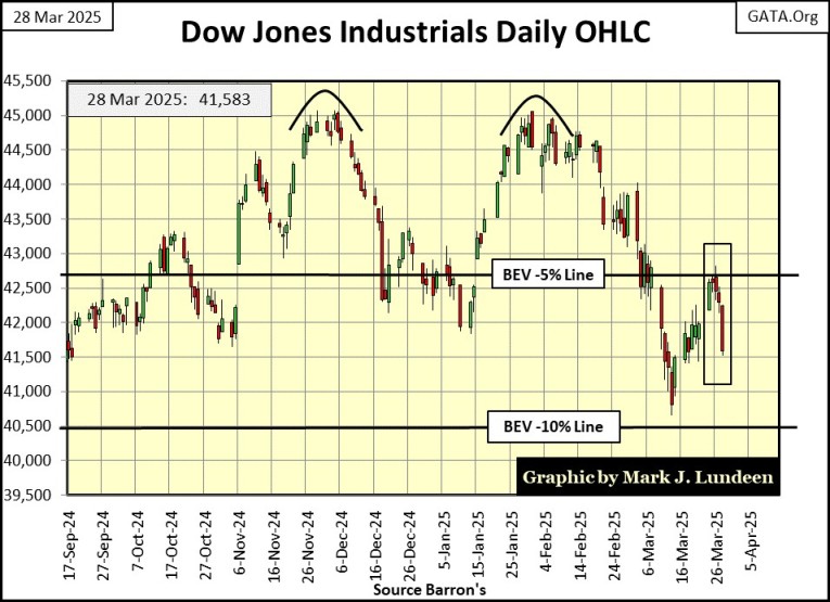 As 2025 now flows into spring, something is changing in the stock market. The Dow Jones has slipped below scoring position, as seen below with my chart of the Dow Jones in daily bars.