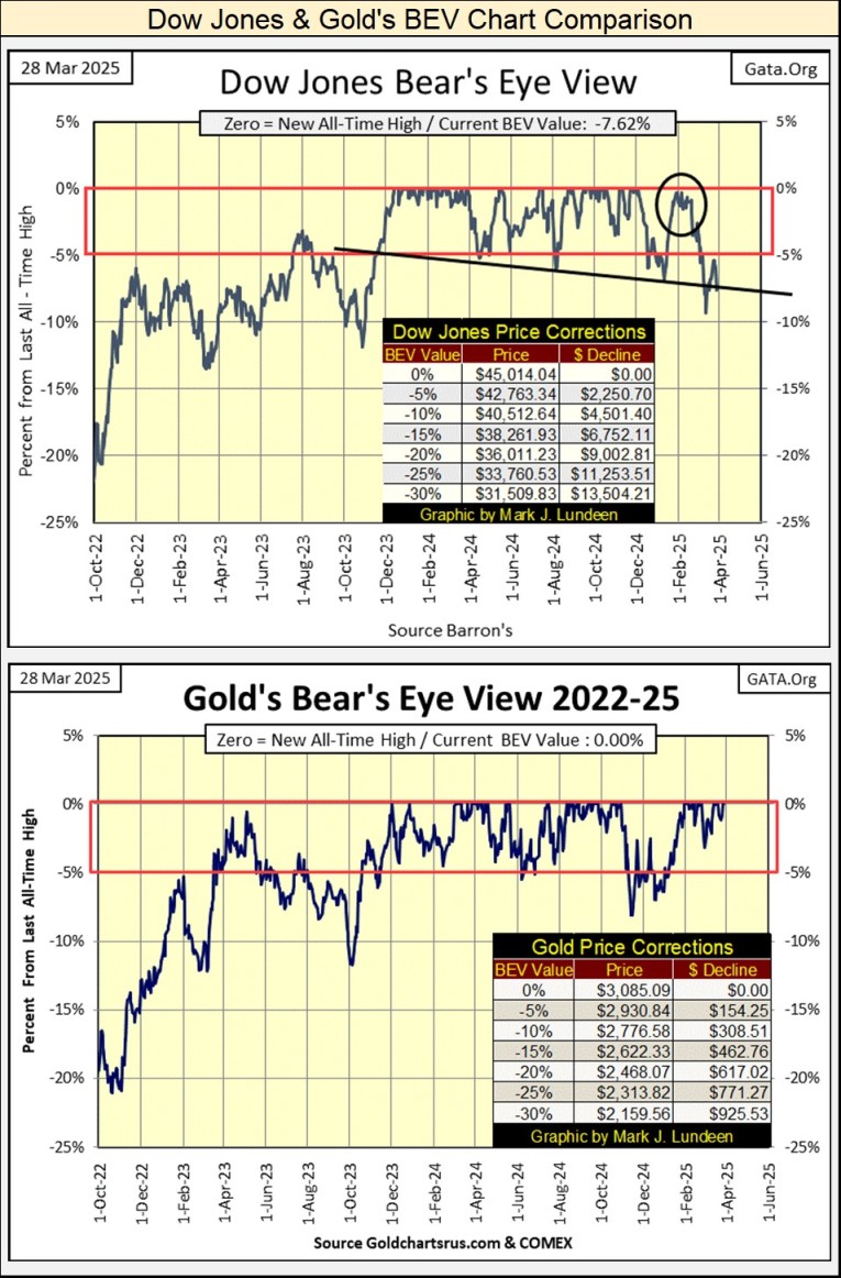 Where should someone move some of their funds into? I like gold, silver and their miners. Let’s compare the Dow Jones BEV plot, with gold’s, in their BEV charts below.