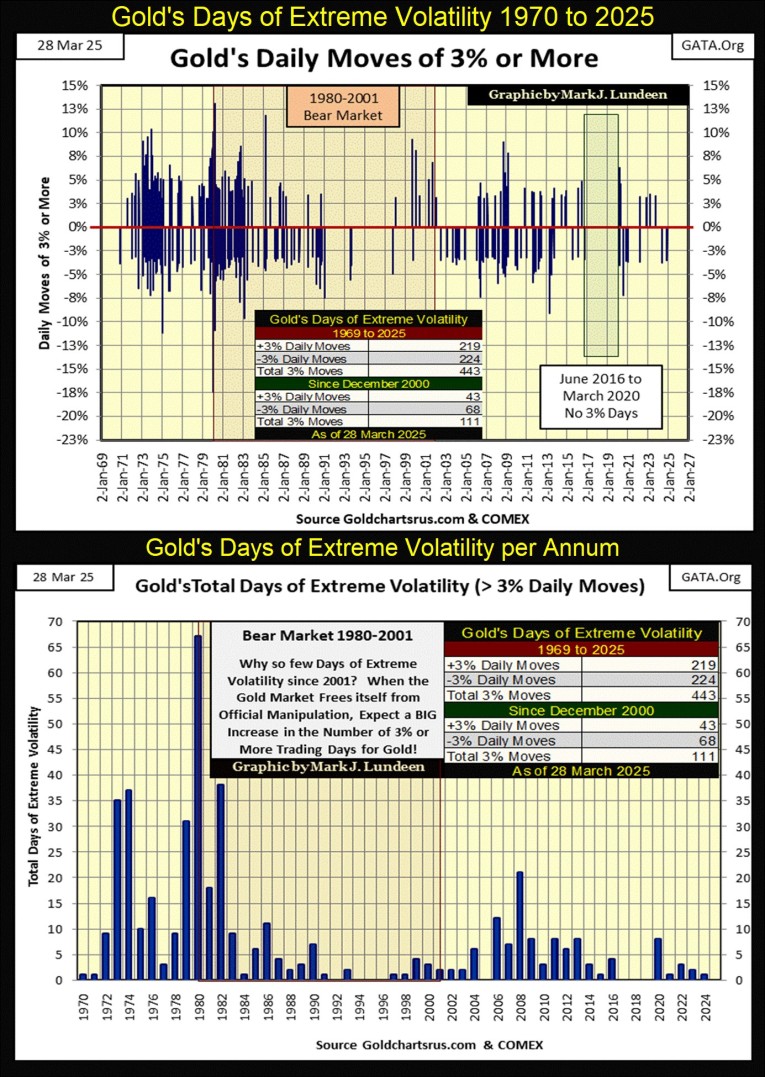 Why this inconsistency in gold’s 3% days seen below? Well, this is only so if one is looking for a connection between 3% days, and valuation trends in gold’s bull and bear markets. However, as I see this data below, it seems the gold market sees frequent 3% days, when massive flows of money are either flowing into, or out of the gold market.