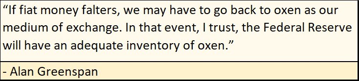 That is just my opinion, an opinion not shared by FOMC Idiot Primate; Alan Greenspan, when he testified before Congress that gold wasn’t necessary as a reserve for the US dollar.