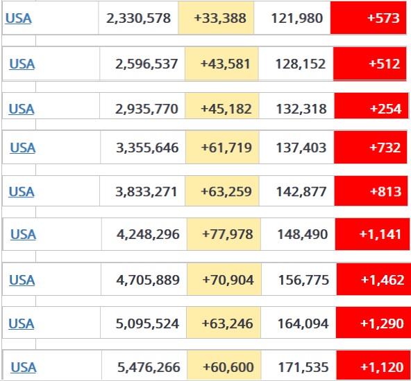 The above table of once a week numbers of new cases and daily deaths presents two distinct sets of numbers. The first four weeks into early July show relatively low numbers for news cases and deaths. These were statistics taken on Saturdays. The last five sets were taken on Fridays. There is a big difference between the weekday numbers and weekend numbers, for both the new cases and deaths. This can be clearly seen on the two charts below of US daily new cases and daily deaths.