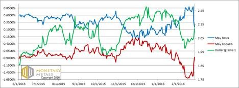 The basis is down because the bid on the May contract is being pressed down. Silver—at this price—is no longer so abundant. The basis is well below LIBOR. However, it’s not particularly scarce. The Ask on the May contract is still strong, still being lifted by buying pressure.