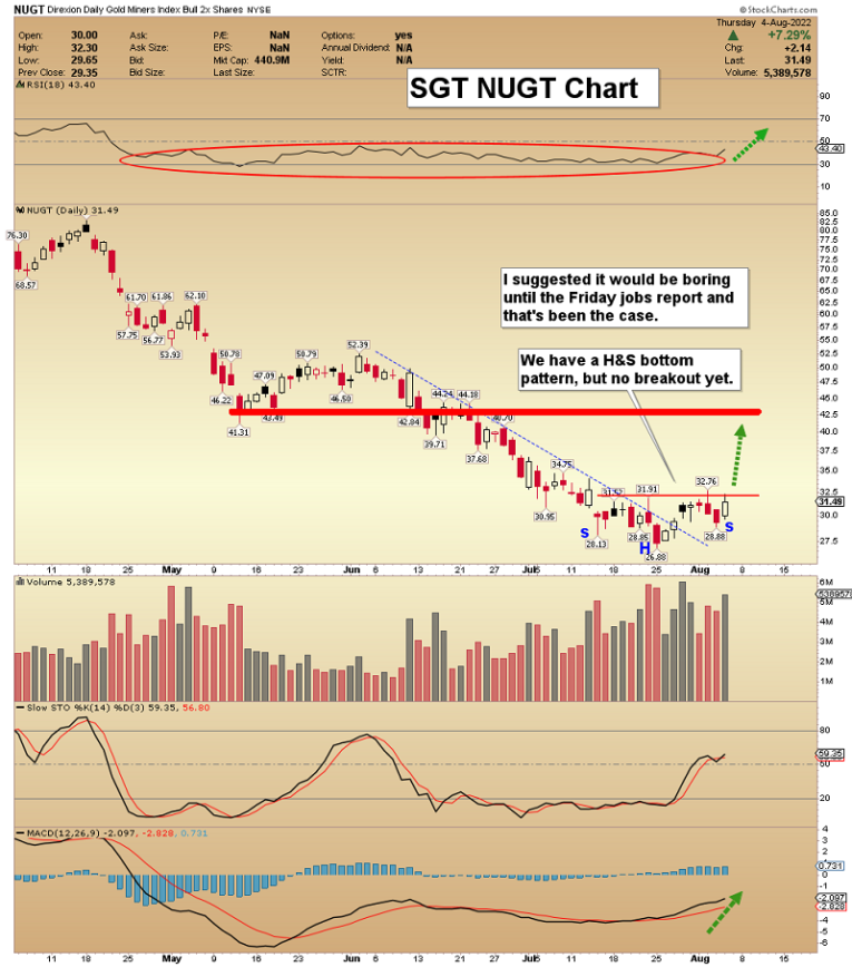 My SG60 service is ideal for investors who like some short-term action and core positions for intermediate gold/silver miners, growth stocks, oil stocks, regional banks, big-name cryptos, and commodity stocks. The Friday jobs report could bring a pause in the current rallies but then I think we rally right into September! The SG60 subscription is just $229 per year, and I have a super special of $199 for 14 months this week! If interested, please send me an email and we’ll do it. Thank-you!