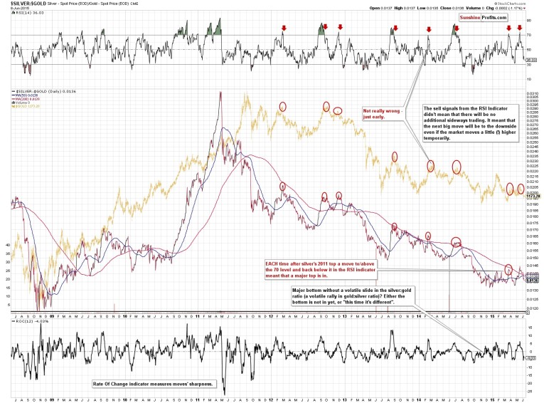 Silver caught the attention of many precious metals traders earlier this year when it outperformed gold in a quite sharp manner and broke above the declining long-term resistance line. Many investors and analysts were cheering and emphasizing silver breakout’s importance and silver’s leadership as something bullish for the precious metals market. We respectfully disagreed. It was the case years ago (!) that silver’s outperformance signaled higher prices for the entire precious metals sector, but it wasn’t the case in the recent history – in fact, exactly the opposite was the case. Several weeks ago we featured the following silver to gold ratio chart (charts courtesy by http://stockcharts.com):