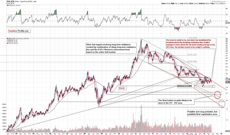 Silver didn’t manage to break above the 50-week average and the 2013 low, so in one way the trend remains down and in another way (taking the declining resistance line) we saw a sell signal because of breakout’s invalidation. Either way, the outlook for silver in the short and medium term doesn’t look good.