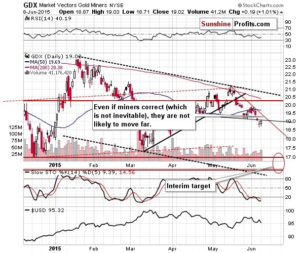 (…) gold stocks have broken below a certain support level. This level is created by the rising line based on the 2014 low and the March 2015 low. The breakdown is not confirmed, but a weekly close below the support is quite a bearish development on its own even if it doesn’t imply a confirmation of the breakdown.
