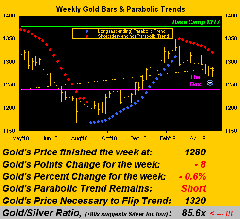 For 2019, four months (plus three trading days in May) are in the books. And the wallflower at this year's Dance of the Markets so far is Gold, essentially "unch" from where it finished 2018 (at 1285), settling out the week yesterday (Friday) at 1280.