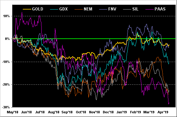 Further, it being month's-end plus three May days, let's pull up (or perhaps better stated pull down) our year-over-year percentage tracks for Gold and several of the highly-visible precious metals equities. From least worst to the worst we find Gold itself -2% vis-à-vis this date a year ago, Franco-Nevada (FNV) -3%; the VanEck Vectors Gold Miners exchange-traded fund (GDX) -10%; the Global X Silver Miners exchange-traded fund (SIL) -22%; Newmont Mining (NEM) -24%; and Pan American Silver (PAAS) -28%. Poor ole PAAS! But from our "Fun With Figures Dept." -- and to be sure the Gold/Silver ratio remains a historically-high 85.6x -- since PAAS' shares went public in 1995, the average Gold/PAAS ratio is 62x. PAAS today is 12 bucks/share: were Gold to reach our conservative forecast high for this year of 1434 and (this is a stretch) those ratios regress to average, we'd find PAAS having nearly doubled to 23. Oh the vacuum of the perfect world, eh? Here are the tracks: