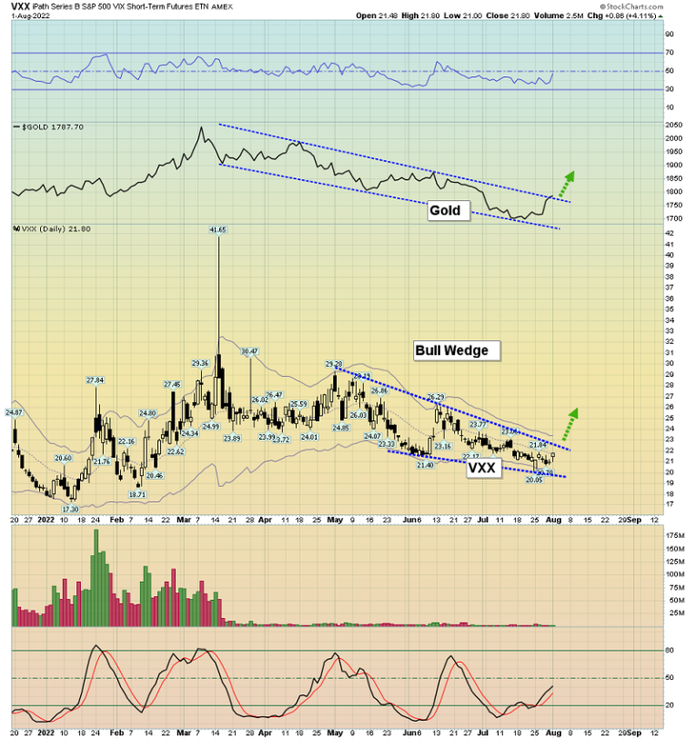 The VXX-NYSE and gold chart. Stock market volatility usually increases when the stock market is falling, but suddenly it’s increasing while the stock market is rising.
