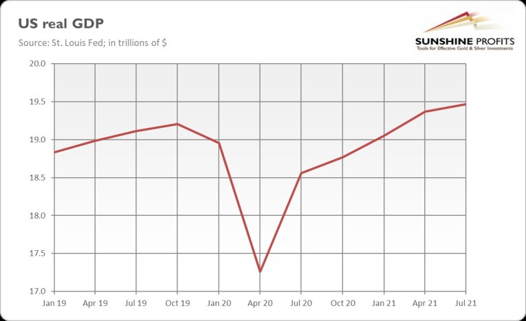 First, there will be the end of the pandemic (or, actually, its most acute phase) and a return to normal economic conditions. In some aspects, such as the GDP, the economy has already recovered from the 2020 economic crisis (as the chart below shows). However, broad population immunity and new drugs will limit the economic impact of coronavirus (the virus won’t disappear and will become endemic) in the future. What’s more, the global economy is likely to solve most of the supply problems that emerged last year (although not immediately). The return to normalcy should support risk appetite while hitting the safe-haven assets such as gold.