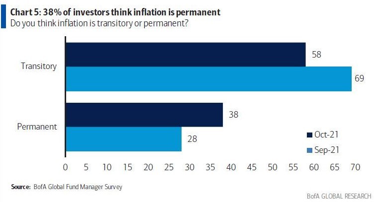 To explain, 69% (28%) of respondents viewed inflation as “transitory” (“permanent”) in September. However, the script has flipped to 58% and 38% in October. As a result, it’s likely only a matter of time before the majority of institutional investors (and the Fed) realize what’s actually happening on the ground.