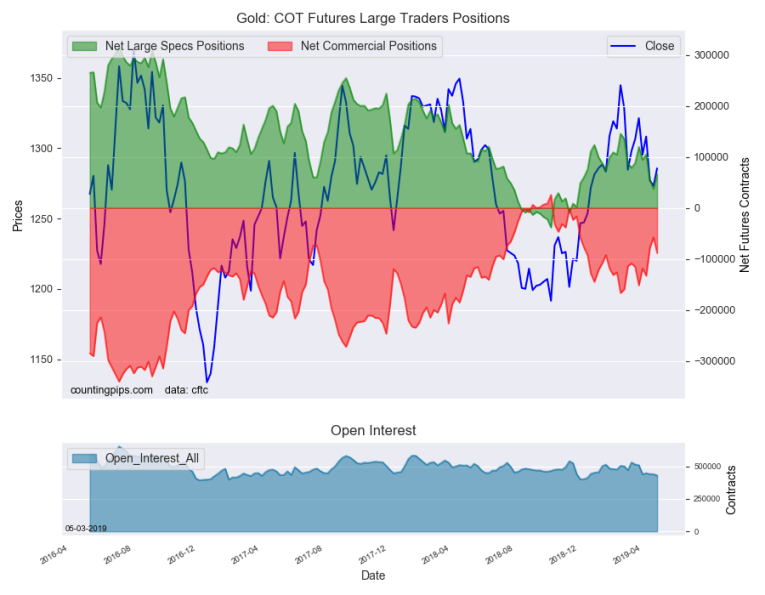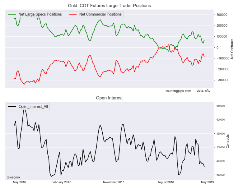 The non-commercial futures contracts of Gold futures, traded by large speculators and hedge funds, totaled a net position of 66,219 contracts in the data reported through Tuesday, April 30th. This was a weekly rise of 28,824 net contracts from the previous week which had a total of 37,395 net contracts.