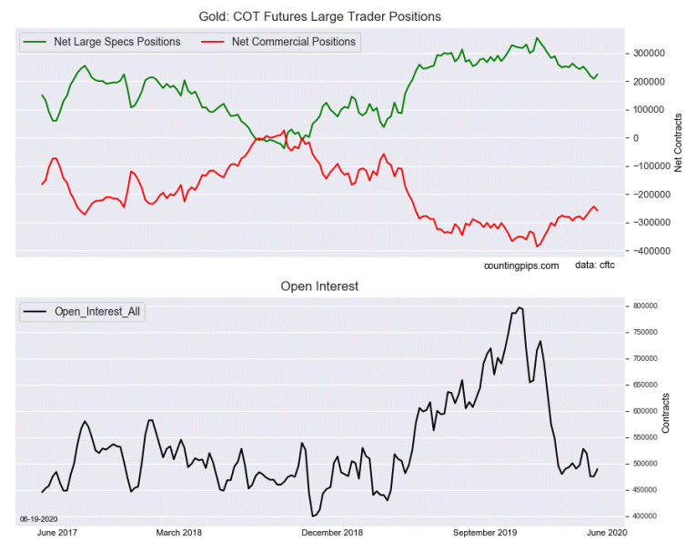 The non-commercial futures contracts of Gold futures, traded by large speculators and hedge funds, totaled a net position of 224,348 contracts in the data reported through Tuesday June 16th. This was a weekly gain of 15,735 net contracts from the previous week which had a total of 208,613 net contracts.