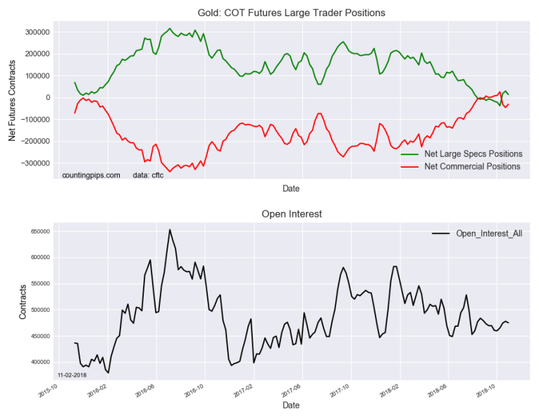 The non-commercial futures contracts of Gold futures, traded by large speculators and hedge funds, totaled a net position of 13,194 contracts in the data reported through Tuesday October 30th. This was a weekly lowering of -16,194 contracts from the previous week which had a total of 29,388 net contracts.