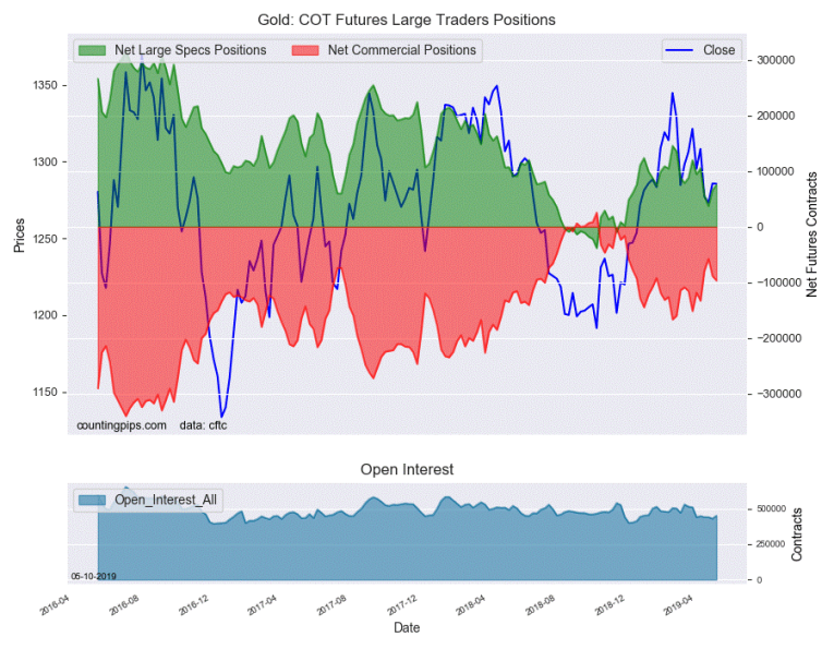 The non-commercial futures contracts of Gold futures, traded by large speculators and hedge funds, totaled a net position of 75,411 contracts in the data reported through Tuesday, May 7th. This was a weekly gain of 9,192 net contracts from the previous week which had a total of 66,219 net contracts.