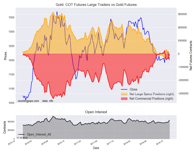 The non-commercial futures contracts of Gold futures, traded by large speculators and hedge funds, totaled a net position of -9,247 contracts in the data reported through Tuesday November 13th. This was a weekly reduction of -28,273 net contracts from the previous week which had a total of 19,026 net contracts.