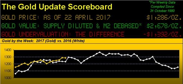Then consider this is our 10th weekly missive since that from the week ending 12 July 2013 -- almost four years ago -- for which gold has settled in the 1280s, and price's vicissitudes aside, we ain't gone nowhere rather than being way up there. C'est ça, mon frère, (the French election in the air).