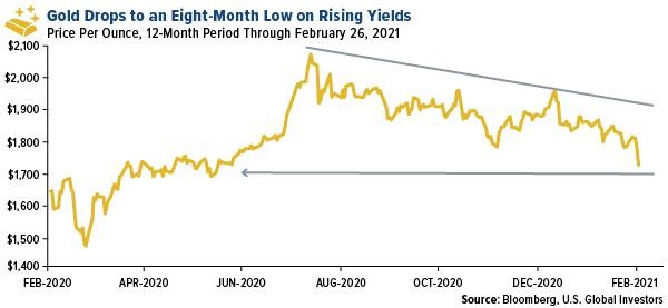 When it comes to trading gold, I think what's important for investors to pay attention to is not so much nominal yields but real yields. Right now the 10-year bond is trading with a yield of 1.4%, which is the exact same rate that consumer prices rose at in January year-over-year, according to the Bureau of Labor Statistics. So in reality, inflation is eating your lunch even with the yield increase.