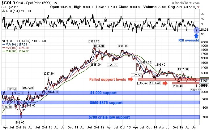 Precious metals showed bullish technical signs in early 2015, including gold making a higher low at $1,141 versus the November 2014 low of $1,130. However, in late May gold failed to make a higher high, which was a pivot point and signal that lower prices could be ahead. This bearish signal was confirmed on July 20th, when gold dropped below both the 2014 and 2015 low and we published an article stating our bearish short-term outlook. Prices have continued to slide since then, with gold down another 4% and mining stocks falling by nearly 14%.
