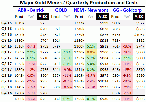 This table looks at the quarterly production, its year-over-year change, and all-in sustaining costs per ounce mined of Barrick, Randgold, Newmont, and Goldcorp during today’s secular gold bull. It started in late Q4’15 out of deep 6.1-year secular lows in gold. Barrick deleted Randgold’s old website, so there is no Q4’15 GOLD data. And as of Wednesday afternoon NEM and GG hadn’t yet reported full Q4’18 results.
