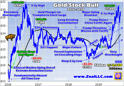 GDX started rolling over again as gold’s latest tariff-hike-sparked surge stalled out. By mid-August GDX had slumped 6.2%, but much residual excitement remained after such a powerful upleg. Gold was still mostly holding the psychologically-heavy $1500 level after finally regaining it in early August for the first time since April 2013. Gold-stock traders were rightfully anticipating far-higher profits going forward.