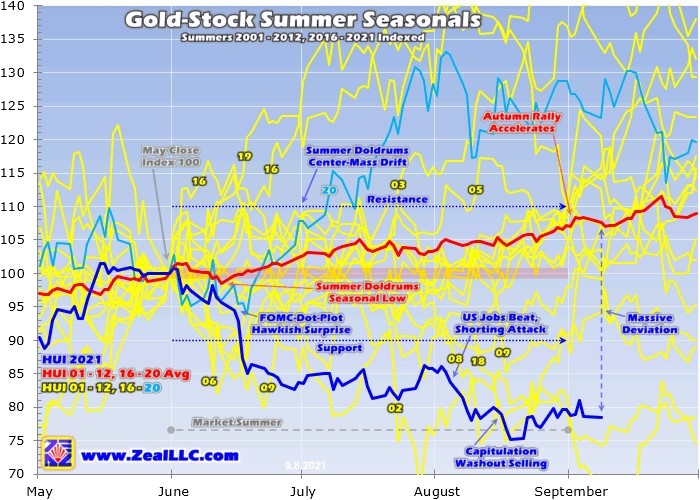 That stoked bearishness to such irrational extremes that heavy capitulation selling flared violently a couple weeks later, even though gold prices were stable. As a result, the gold stocks plunged to an indexed level of just 75.2! They had lost a quarter of their value summer-to-date, their worst performance ever at that point in all 18 modern gold-bull years. On average their seasonal low is just 98.6 back in mid-June.