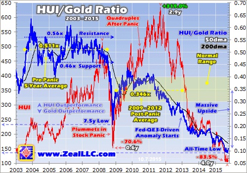 That wildly-unprecedented open-ended debt-monetization campaign is the sole reason gold and the gold stocks have suffered so much in recent years. As the Fed’s QE3 bond buying and associated jawboning about more money printing levitated the stock markets, capital fled alternative investments led by gold. The resulting radical gold underinvestment (http://www.zealllc.com/2015/radgldui.htm) will reverse as the Fed-inflated stock markets roll over.