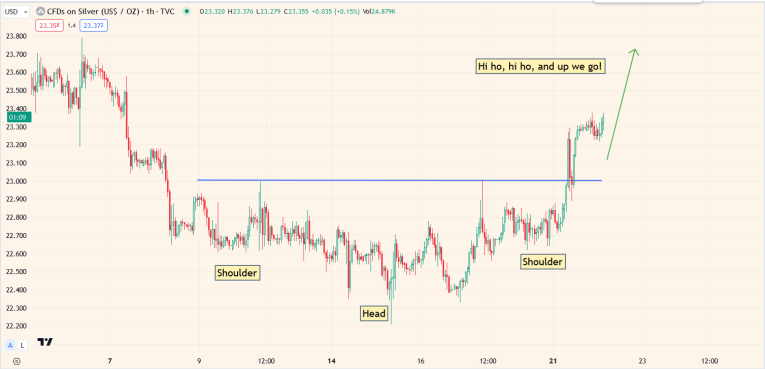Double-click to enlarge. It appears that silver may be leading the way! A fabulous inverse H&S breakout is in play.
