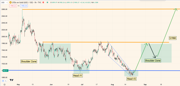 A complex inverse H&S pattern of size also appears to be in play, targeting the $2080 zone.