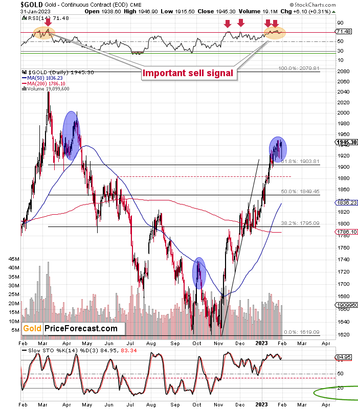 Gold’s RSI indicator is above 70, which is a classic signal, and the MACD based on the GDXJ (lower part of the chart) moved below its signal line, which is a sell indication. The same thing happened at the April 2022 top, by the way. Speaking of previous tops…