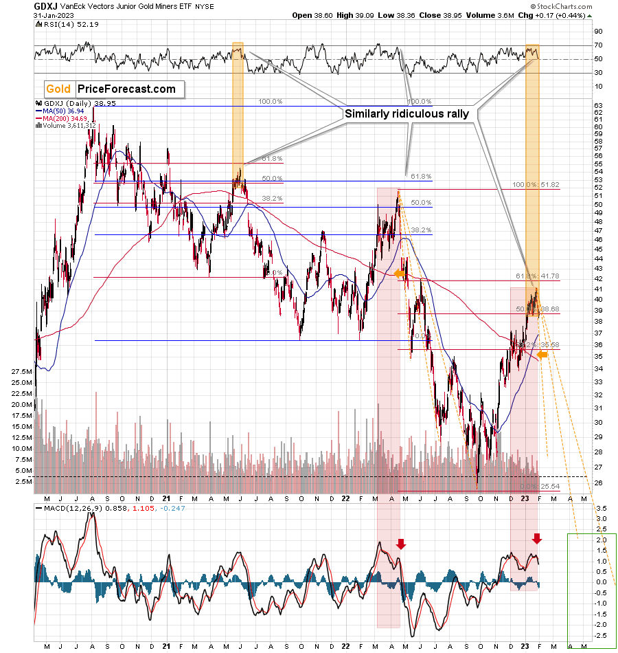 Even more importantly, the GDXJ’s correction of more than 50% but less than 61.8% of the preceding decline is something that ended two of the recent short-term but big corrections. The first one ended in June 2021, and the second one ended in April 2022. Now it seems that the current one ended in January 2023.