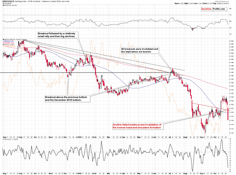 Some may say that the decline is temporary and that it took place only because of the very bad earnings Q3 report from Goldcorp. We disagree. Please note that multiple mining stocks declined very significantly, it was not only Goldcorp. Besides, in case of many other companies (i.a. Barrick, and Newmont), the reported earnings beat analysts’ expectations despite reporting losses. All in all, it seems that the decline really shows the weakness of the mining stocks and should be viewed as an important bearish sign.
