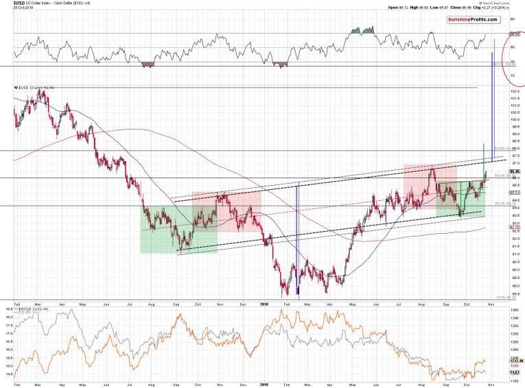 For two consecutive days, the USD Index closed the day visibly above the neck level of its inverse head-and-shoulders pattern. This is a critical development as it’s the key step in breakout’s verification. Ideally, we would like to see three consecutive closes, along with a weekly closing price above the neck level, in order to say that the breakout is truly confirmed. The week is ending today and at the moment of writing these words, the USD Index is trading above 96.80, so the odds are that we’ll have this third (and weekly) close today.