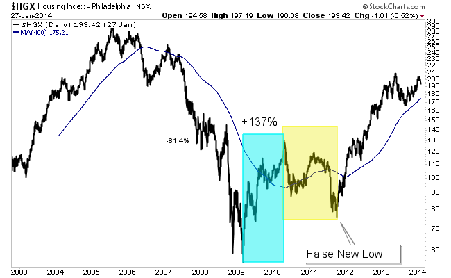 The housing sector declined 81% from its peak in 2005 to the market bottom in March 2009. Then it rebounded 137% before correcting 42% over 18 months. The correction ended with a false new low.