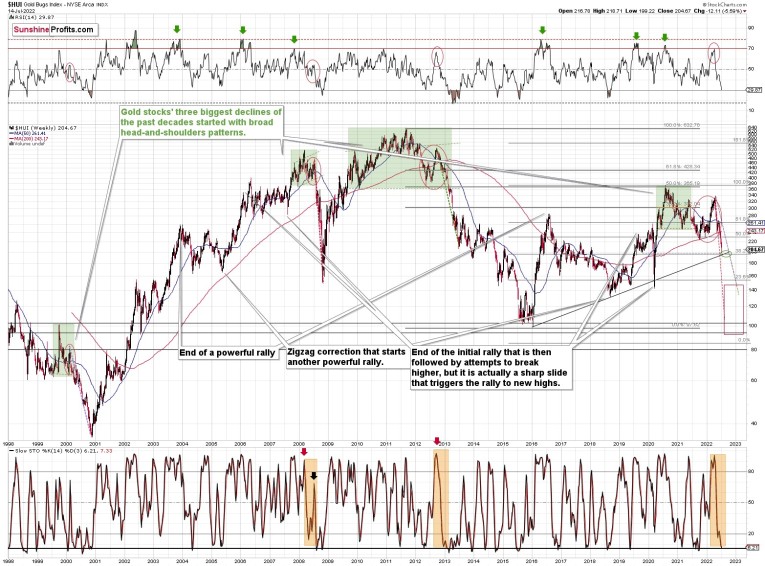 The Russian invasion triggered a rally, which was already more than erased, and if it wasn’t for it, the self-similarity would be very clear (note the head-and-shoulders patterns marked with green). Since the latter happened, it’s not as clear, but it seems that it’s still present. At least that’s what the pace of the current decline suggests.