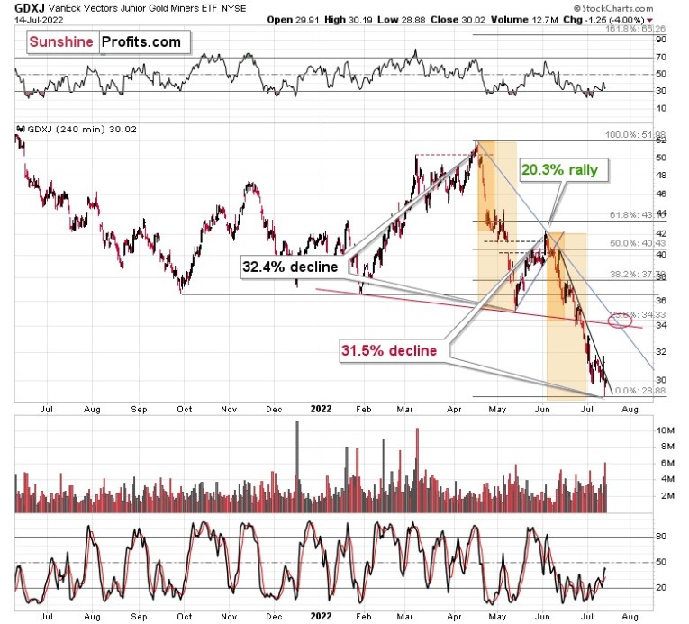 Based on how long the corrective upswings took in 2008 and how long the recent one took, the upcoming corrective upswing is likely to take between 5 and 10 trading days. If the bottom formed yesterday, which seems likely as the GDXJ ETF is already up by over 1% in today’s London trading, then we can expect the next local top to form within 1-2 weeks. In other words, it seems that the corrective upswing is likely to end in the next part of July – probably in its final week.