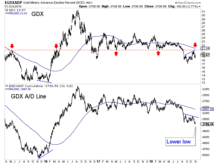 Just a week after GDX retested major resistance at $21, its A/D line closed at a lower low.
