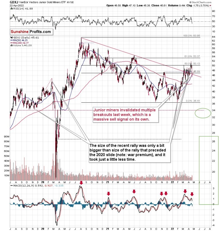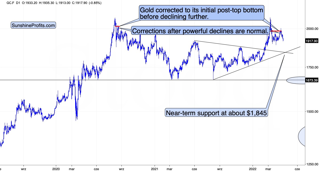 In the case of gold, please note how it followed its self-similarity to the post-2020 top trading patterns. The yellow metal moved slightly above its initial post-top bottom, and then it immediately turned south.