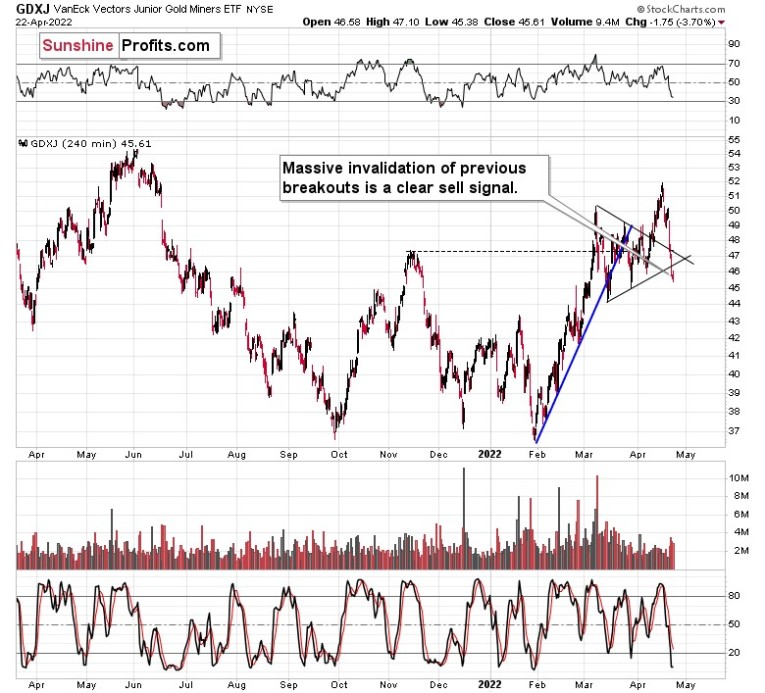 Remember when gold tried to rally above $2,000? It was just a week ago. Now, it’s likely about to drop below $1,900, silver and mining stocks are sliding too. While the white metal has been weak for a while now, mining stocks finally woke up to the reality and appear to be catching up with gold’s and stocks’ declines.