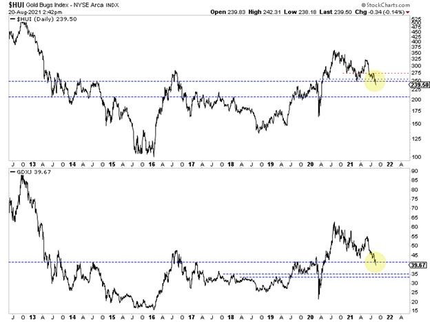 In our last editorial, we noted that if the gold stocks (HUI & GDXJ), which were in a precarious position, lost their lines of support, it could lead to another 15% to 20% downside.