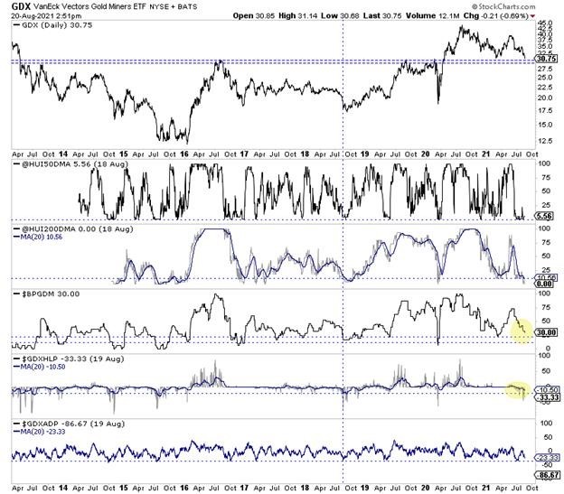 The chart below includes GDX and breadth indicators for the HUI and GDX at the bottom.