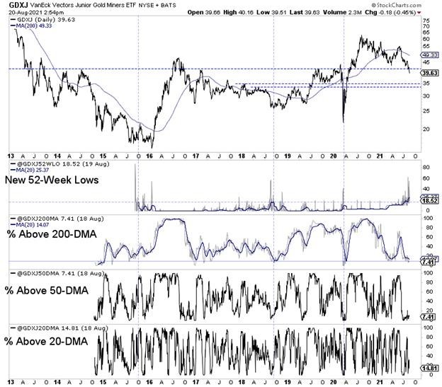 The next chart shows GDXJ and our custom breadth indicators, including the new 52-week lows, which we created this week.