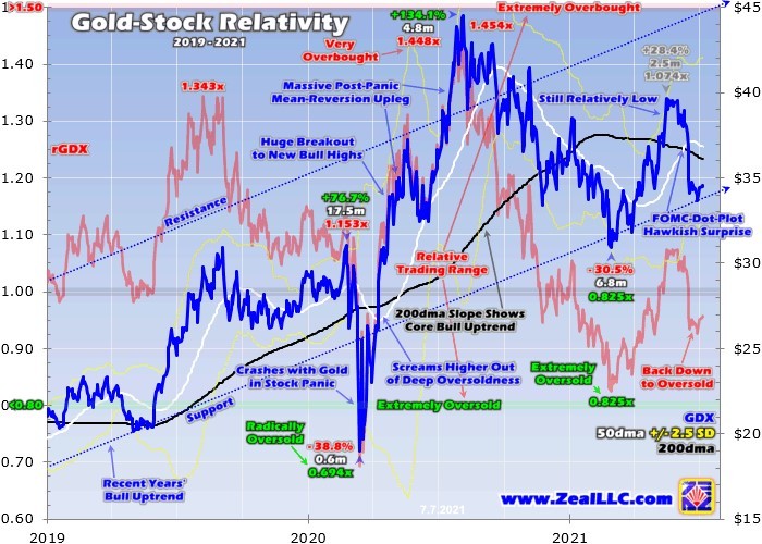 Over the past five calendar years, GDX has tended to meander between 80% to 150% of its 200dma. That is the current Relative GDX trading range. At most in early June well before those hawkish dots, this rGDX indicator had crept up to 1.075x. Historically gold stocks need to exceed 1.30x to even start looking overbought. Bull uplegs generally aren’t at risk of rolling over into corrections until the rGDX shoots over 1.40x.