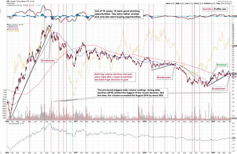 Namely, we’re going to discuss the huge daily volume spikes. And in particular, we’re going to focus on days when the silver miners (we’re using the SIL ETF as a proxy for the sector) declined on big volume. There were quite a few such days since early 2016 and they were almost all characterized by analogous price action - not only in the case of silver miners, but also in the case of gold.