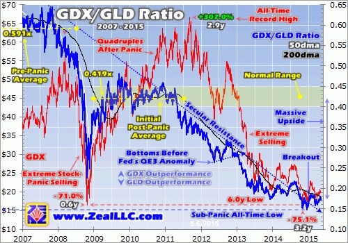 And it looks to be already underway! The past half-year’s stealthy gold-stock uptrend has broken this GDX/GLD Ratio back above its long-term secular resistance that dominated since late 2007. This is a major trend change that is likely to prove pivotal. Back in mid-December, the GGR fell to its lowest level ever at 0.149x. A share of GDX was worth just 0.149x a share of GLD, an extreme never before witnessed.