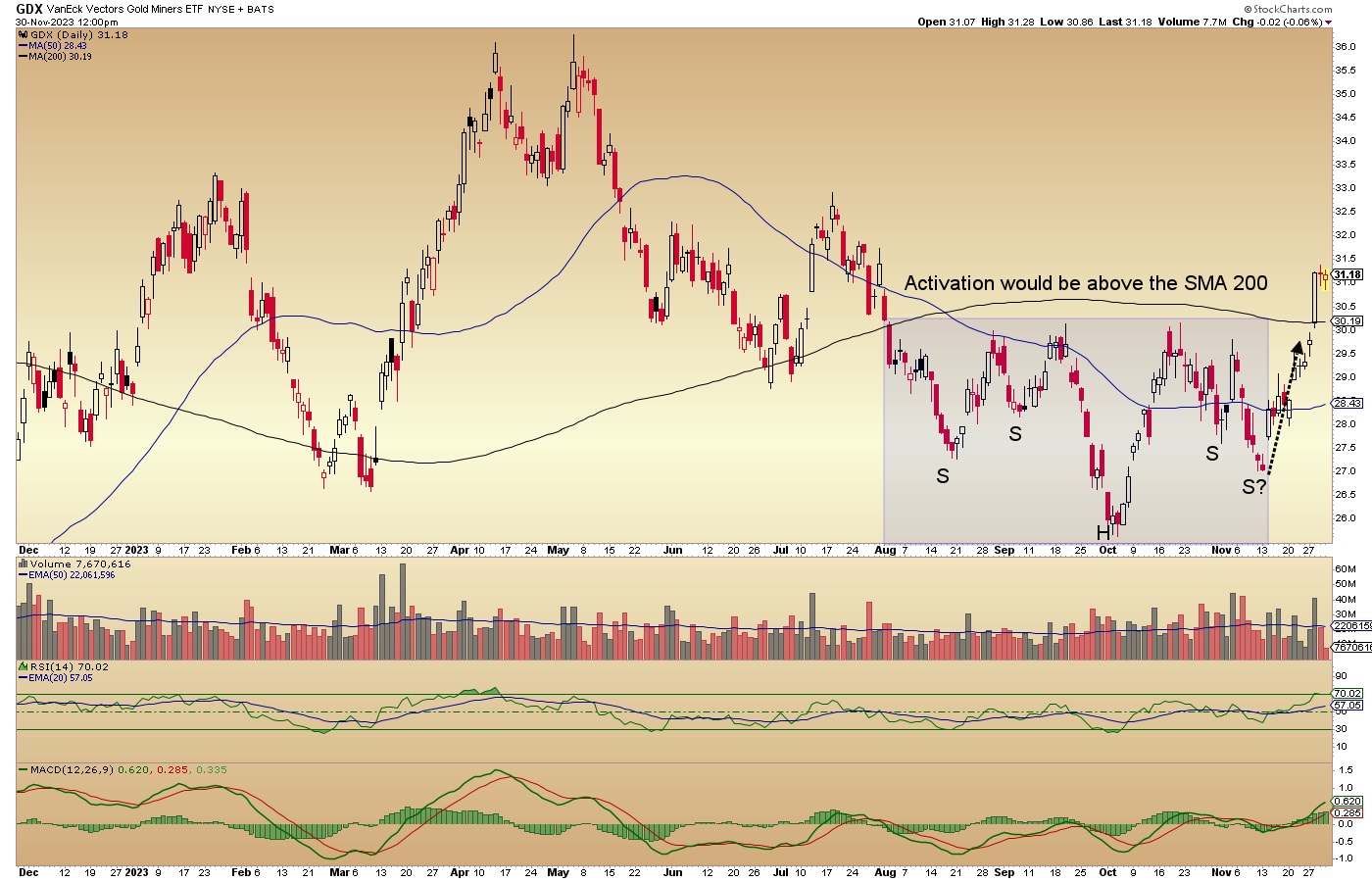 That launch broke a pattern that I speculated upon publicly on the day GDX hit its most recent low back on November 13. The original post shows the state of daily GDX then along with my imagining of what could transpire (black dashed arrow).